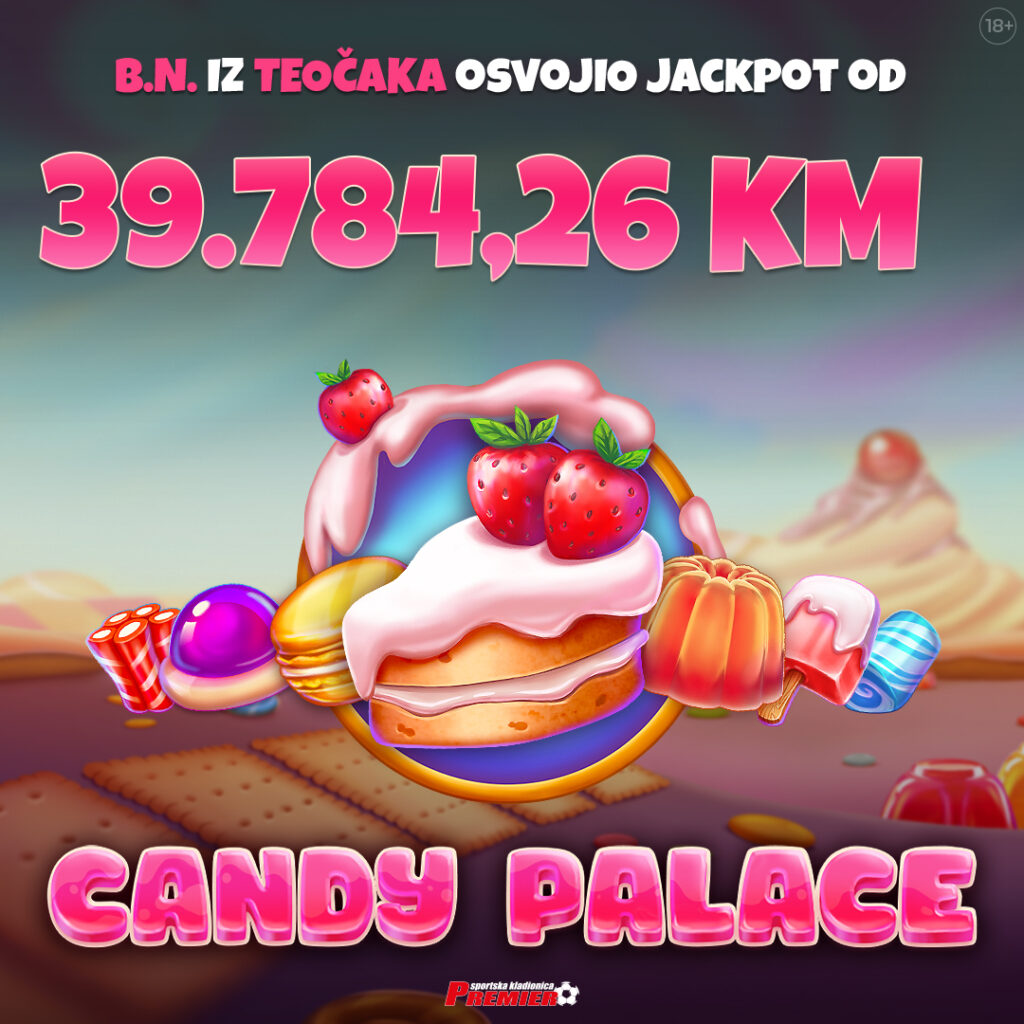 Čestitamo igraču B.N. koji je u igri Candy Palace na ulogu od 20 KM po spinu dobio JackpotCards bonus, pronašao tri karte sa znakom srca i osvojio fantastičnih 39.784,26 KM!